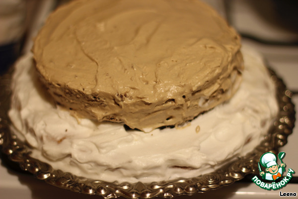 Затем собираем торт. Сначала белые коржи, хорошо пропитанные пропиткой и обильно смазанные взбитыми сливками. Темные коржи я обрезала, приложив тарелку, уменьшив диаметр, пропитала и обмазала со всех сторон коричневым кремом.