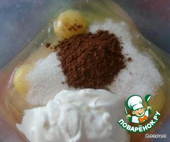 Готовим бисквит: взбиваем яйца, сахар, ванилин, разрыхлитель или гашеную соду, сметану, какао и муку.
