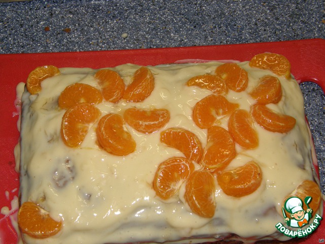 Украшаем сочными пропитанными мандаринками наш тортик и ставим в холодильник минимум на 2 часа.