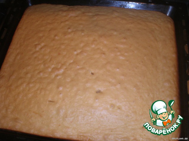 Разогреваем духовку до 200 град.На противень смазанный слив. маслом выливаем 1/2 теста и выпекаем корж.Выпекаем 25- 30 мин.Тоже самое проделываем с оставшимся тестом.