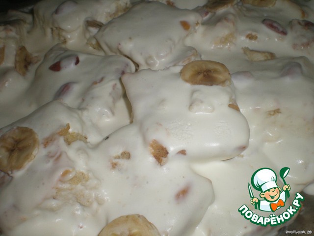 После последнего слоя торта, политого кремом посыпаем все орехами или фруктами.Оставляем торт пропитаться.