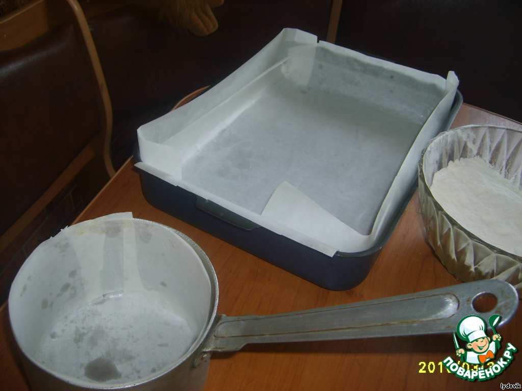 Застилаем пергаментной бумагой формы так, чтобы бортики бумаги доставали до края форм. У меня не было маленькой формочки, пришлось использовать маленький ковшик...