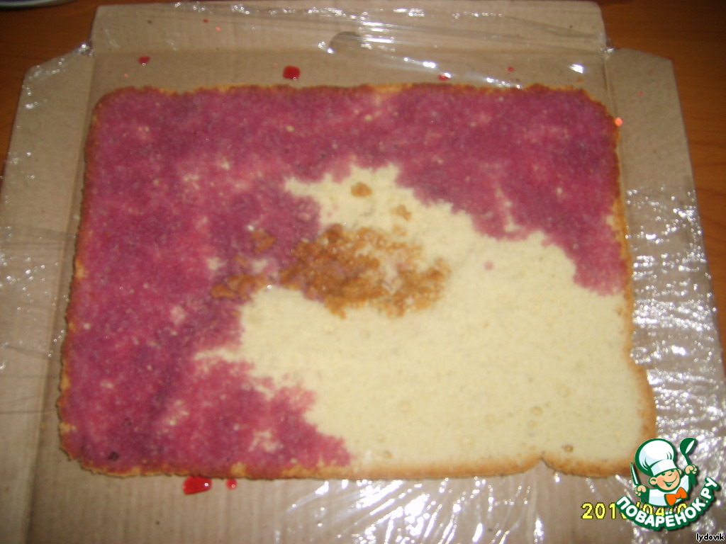 Начинаем собирать наш тортик: пропитываем фруктовым сиропом (вода+вишни+сахар довести до кипения и варить 5 мин.), у меня был вишневый, поэтому бисквит приобрел красивый малиновый оттенок. Можно использовать любой сироп по желанию.