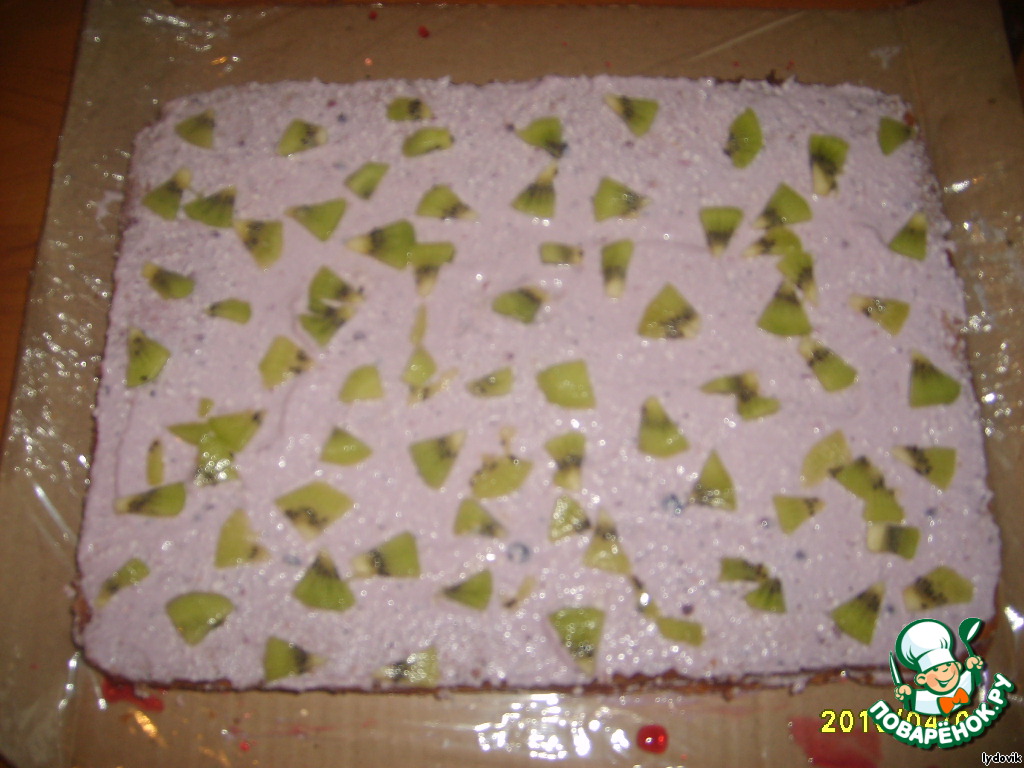Промазываем творожным кремом: (творог+йогурт взбить, добавить немного сахара, если не сладко) и укладываем сверху на крем кусочки фруктов,