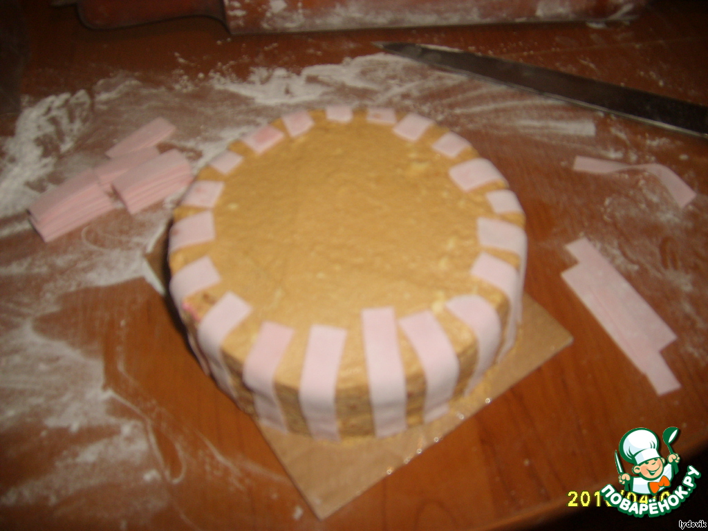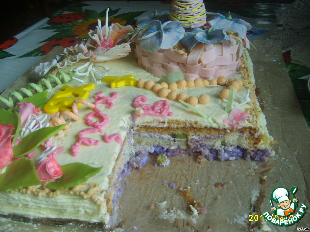 Вот такой разрез у тортика получился...Торт очень сочный и не такой сладкий. Приятного аппетита. Дерзайте и у вас все получится. Учитывая что это мой второй опыт украшения торта мастикой, я думаю получилось не плохо...