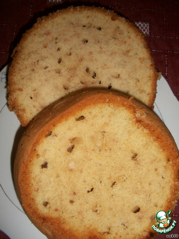 Готовый бисквит остудить и разрезать на 2 части.