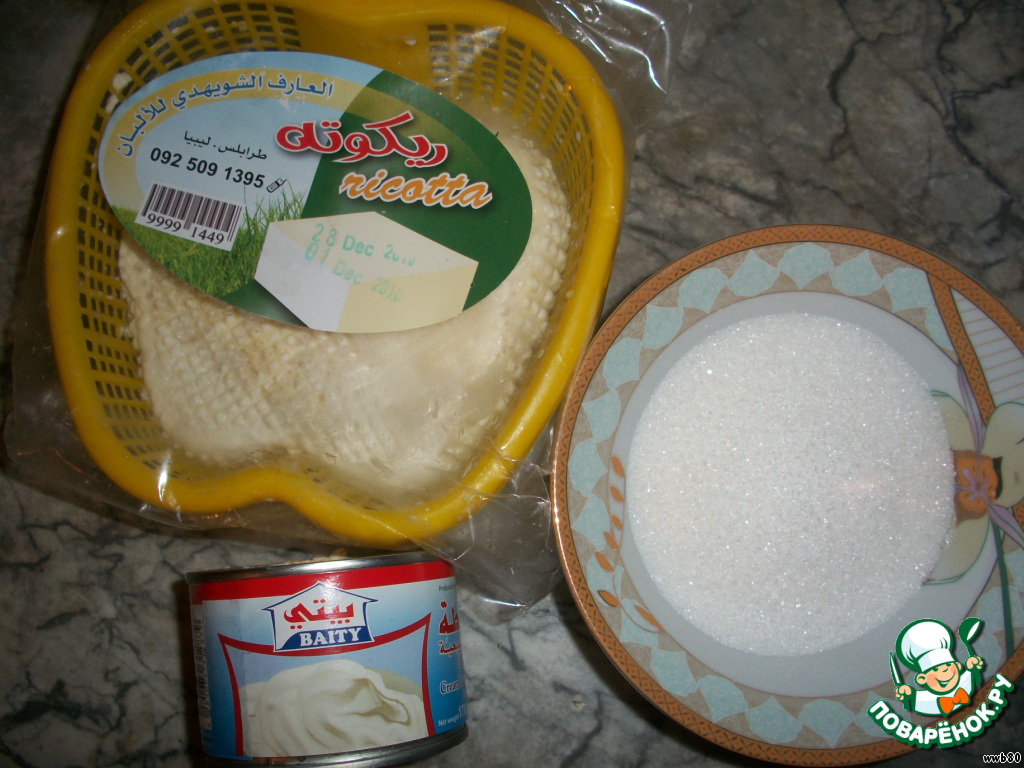 Смешать рикотту, сахар и сливки.