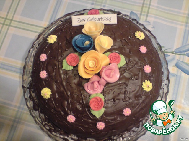 Дать постоять минут 5 и залить весь торт шоколадной глазурью.