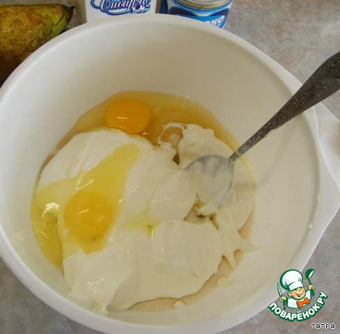 Яйца, сахар, сметану, половину сгущенки и грушу соединить и перемешать.