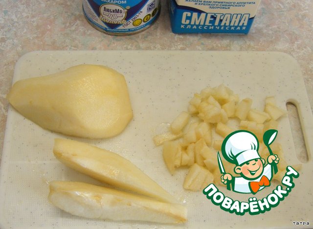 Грушу очищаем от кожуры и семян, затем мелко нарезаем.