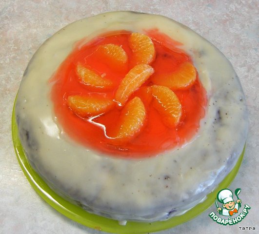 Сверху выкладываем застывшее желе, аккуратно снимая с тарелочки. Торт сразу же ставим в холодильник (чтобы не потек)