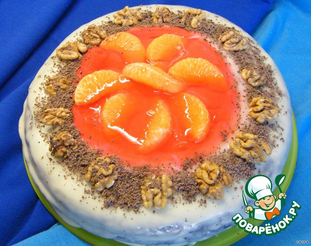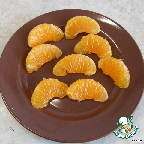 Очищаем мандарин на дольки, снимаем все пленочки. Укладываем в тарелку узором на ваше усмотрение и заливаем теплым распущенным желе, даем застыть.