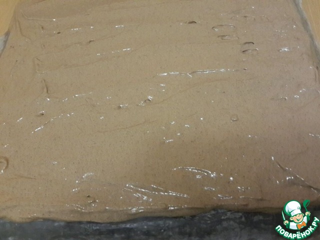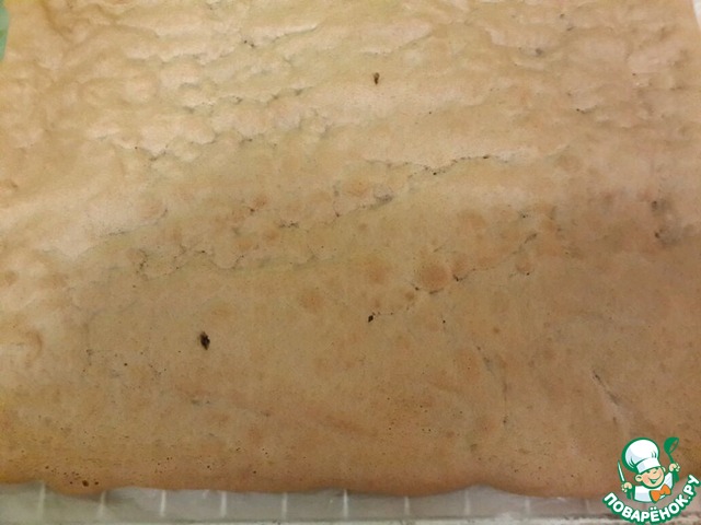 Тесто делим на 3 коржа. Тесто размазываем в тонкий корж. Печем на обратной стороне противня на пергаменте.