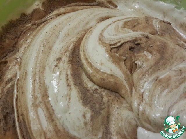 Муку просеять с какао и добавить к нашей массе. Мешать лопаткой снизу вверх.
