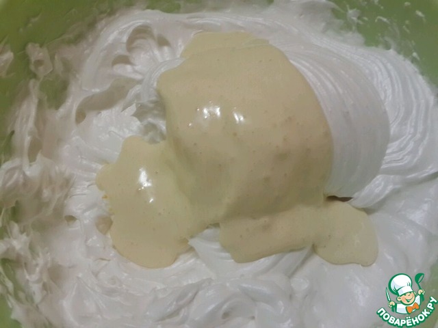 В белки добавить 0.5 ч. л лимонной кислоты. Взбить до легких пиков и по не многу добавить сахар. Взбить до жестких пиков. В белки ввести желтковую массу, взбивая миксером на минимальной скорости.