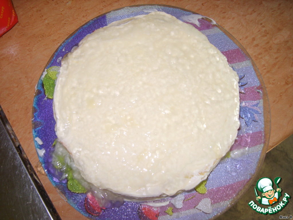 | Рецепт взят с сайта готовим. ру, но немного видоизменен :) Могу сказать, что торт достаточно легкий, в нем очень мало муки. Нежный, не приторный... вобщем, отлично подходит для летнего чае/кофепития :) |