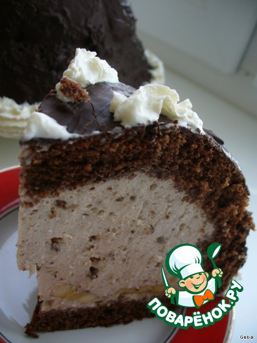 6) На купольный корж выложить почти весь крем, сверху крема положить кружочки банана. Потом сверху тонкий слой, оставшегося крема и прикрыть второй половиной коржа. Затянуть пленкой и поставить в холодильник на 4 часа (у меня всю ночь там провел)