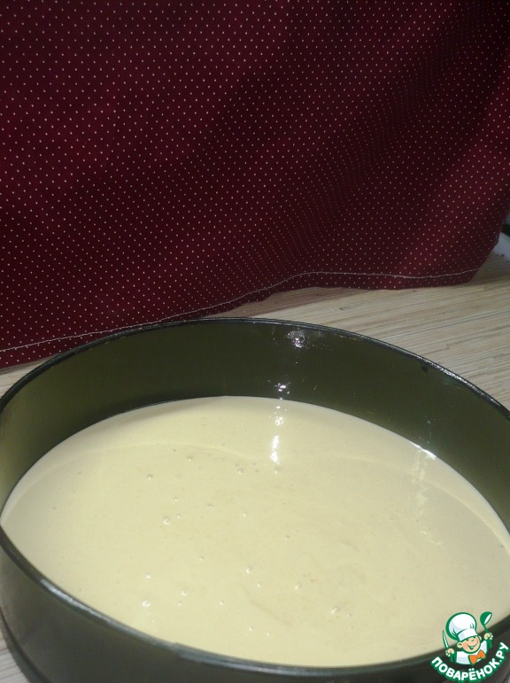 Собираем торт. На нижний корж, пропитанный сиропом, наливаем крем. Лучше собирать в форме с разъемным кольцом.