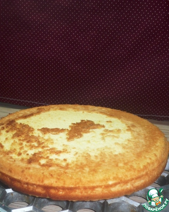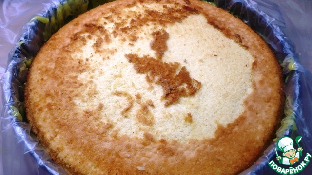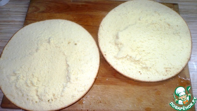 Бисквит разрезать на 2 коржа, пропитать сиропом из воды и сахара.