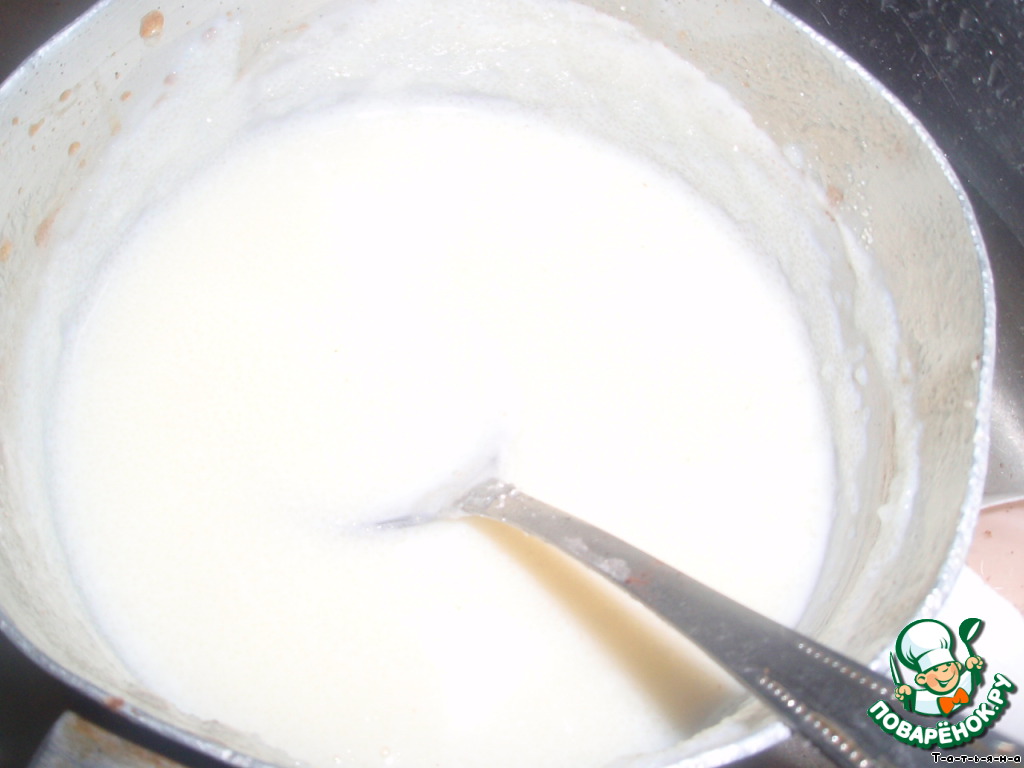 Пока тесто печется, займемся кремом. Варим манку из 0,5 стакана молока, 0,5 стакана сахара и 3 ст.л. манки.