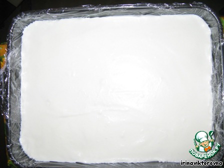 7. выкладываем крем в форму (предварительно постелить в форму пищевую пленку). Можно добавить нарезанные фрукты. И отправляем на холод для застывания.
