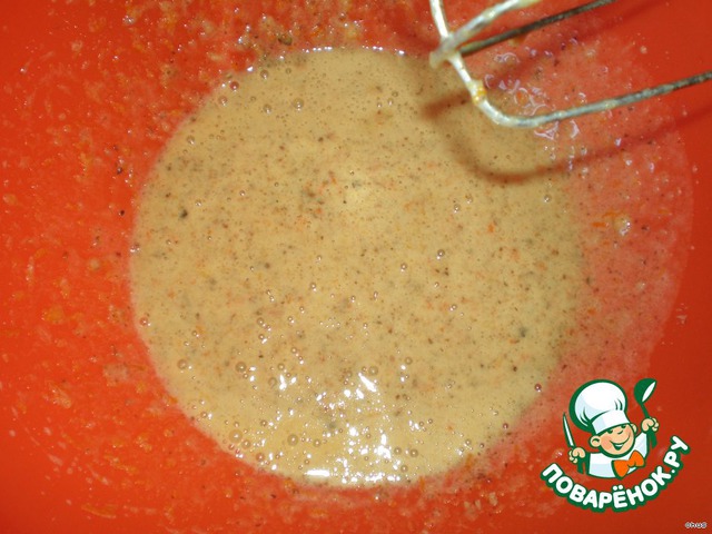желтки взбить с сахаром, ванилином, корицей, орехами