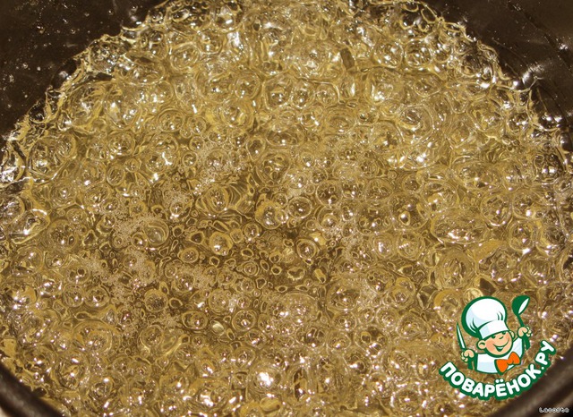 Варим сироп: В кипящую воду всыпать сахар-песок, варить до загустения и приобретения золотистого цвета, постоянно помешивая.