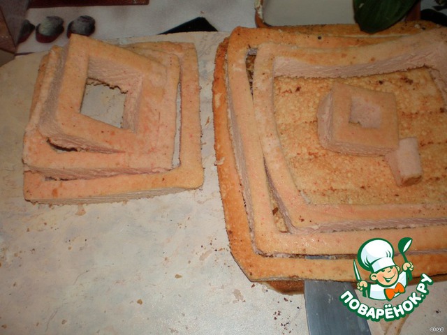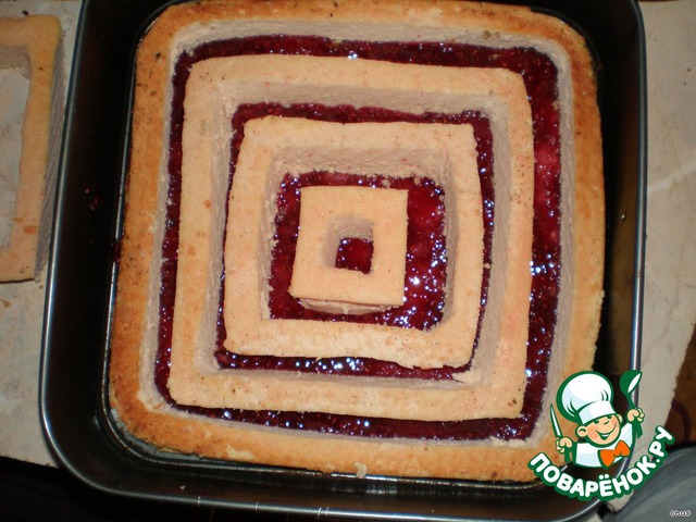 Нижний корж кладем на дно разъемной формы, смазываем джемом. сверху выкладываем вот таким образом детали второго коржа.