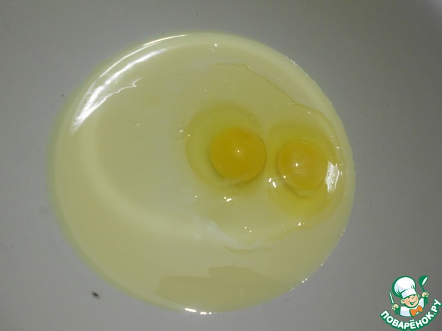 Выливаем сгущенку в миску и добавляем яйца.