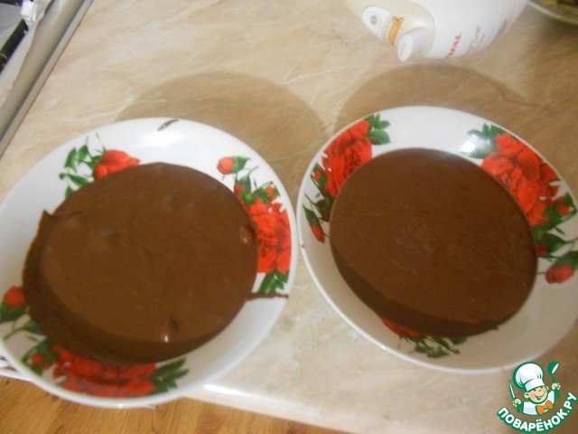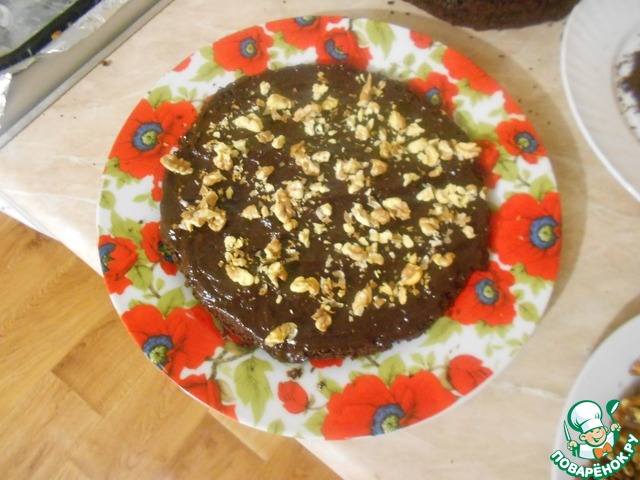 Смазываем коржи кремом, можно по желанию добавить грецкие орехи, подсушенные в микроволновке или духовке.