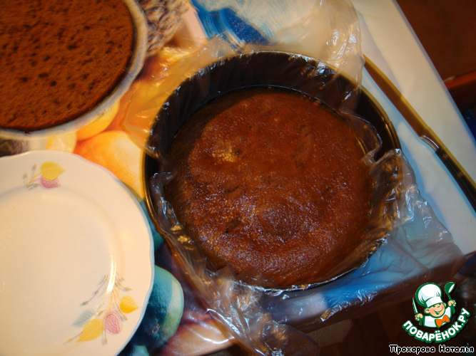 А вот и наш бисквит готов. Дать ему остыть и разрезать на 2 части. Разъемную форму застелить пищевой пленкой. И на дно положить первый корж.