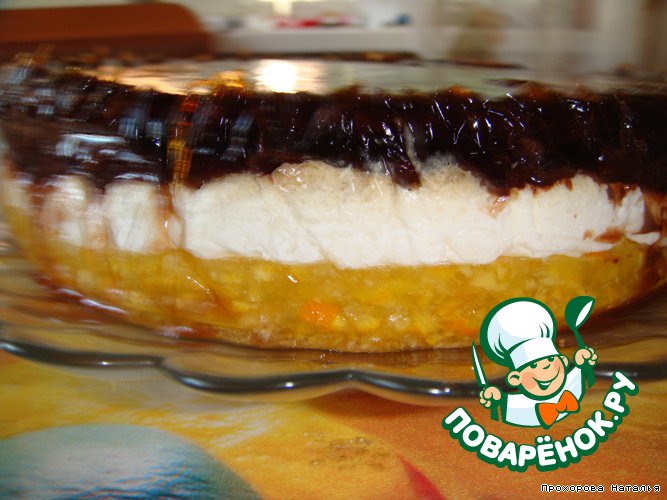 Когда все застынет (у меня часа 3-4 стоял в холодильнике), снимаем бортики формы. Перекладываем торт на блюдо и аккуратно снимаем пищевую пленку.