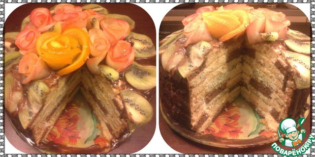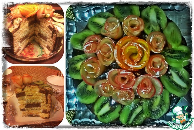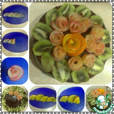 Подготовим фрукты. Яблоко разрезать, убрать сердцевину и порезать очень очень тоненькими дольками (там как получится у вас) примерно 1-2мм. Апельсин так же режем дольками около 1-2мм. На картинке я порезала кружочками, потому что розочка должна была оформляться из них, но у меня в итоге не получились и я сделала такими же дольками как яблоки (попробуйте, может у вас получится из кружочков). Киви режем вдоль, это наши листочки. Их мы сразу выкладываем на края тортика.
