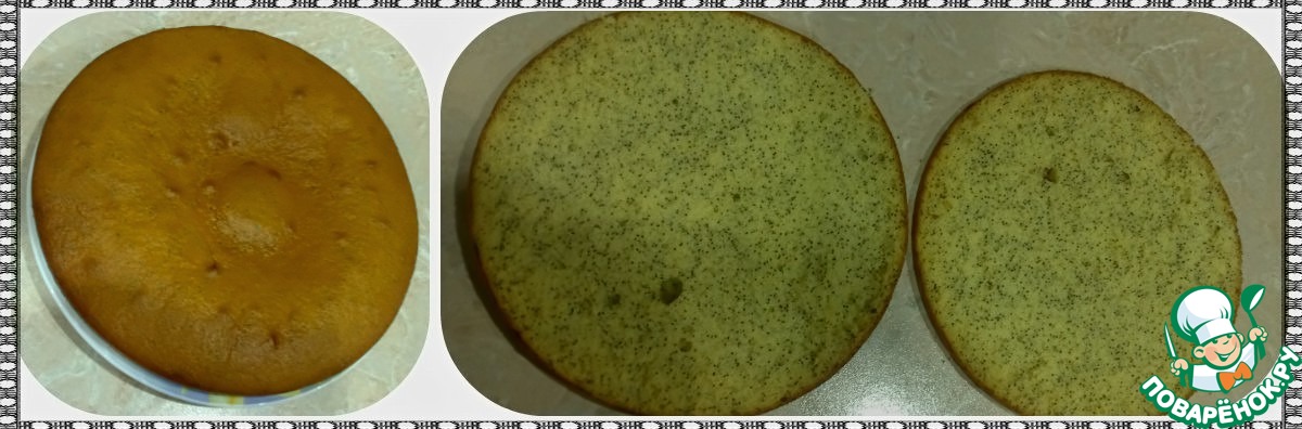Каждую часть выпекать 15-20 мин при температуре 180градусов. Немного остудить и каждый бисквит разрезать пополам. Итого у Вас получится 4 коржа. (У меня их было 8)