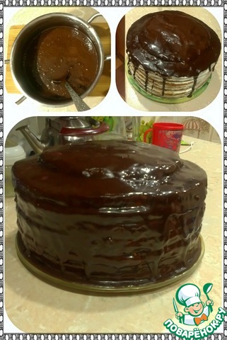 А пока тортик отдыхает, мы сварим глазурь на среднем огне. Сливочное масло слегка растопить, добавить молоко и какао с сахаром. Пока глазурь варится мы постоянно ее помешиваем (чтоб не сгорела). Я варила буквально минутки 3-4 и оставила остывать при комнатной температуре пока тортик наш застывает.