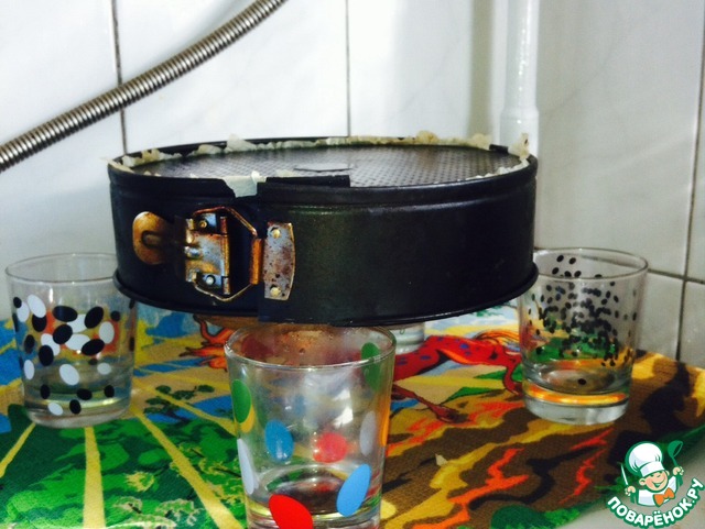 Выпеченный корж остужаем в форме, поставив её вверх дном на четыре стакана. Это делается для того, чтобы середина не просела. Извините за задний план, но это единственное место вне досягаемости страждущих в лице моей дочки. С бисквитом можно работать не раньше, чем через 6 часов. Время приготовления я указала без учёта "отдыха" бисквита. Перевёрнуто можно сразу после остывания, а перед тем, как вынуть, провести аккуратно ножом вдоль бортика, чтобы бока отстали от формы.