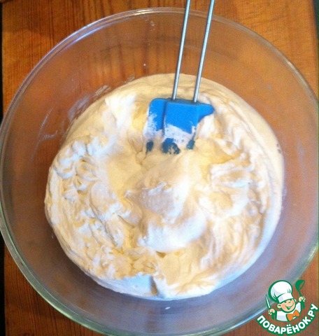 Аккуратно вмешиваем белки в желтково-мучную массу, движениями снизу вверх. Делаем это очень осторожно, долго не мешаем.