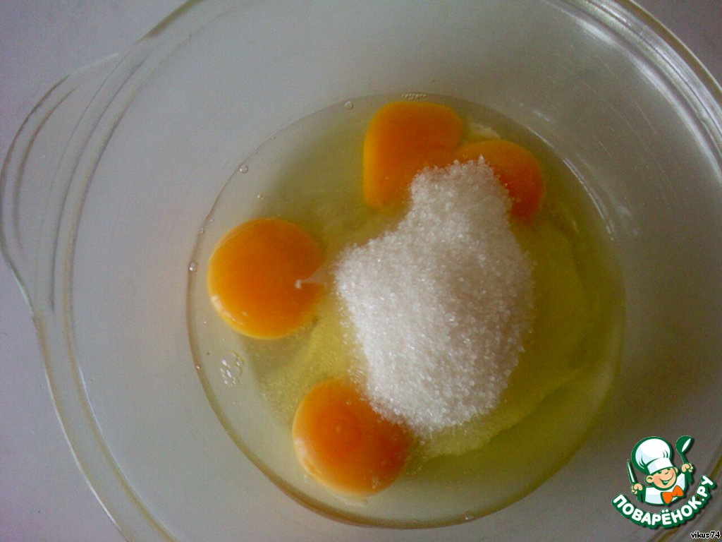 Смешать яйца, половину стакана сахара и полпакетика ванильного сахара.