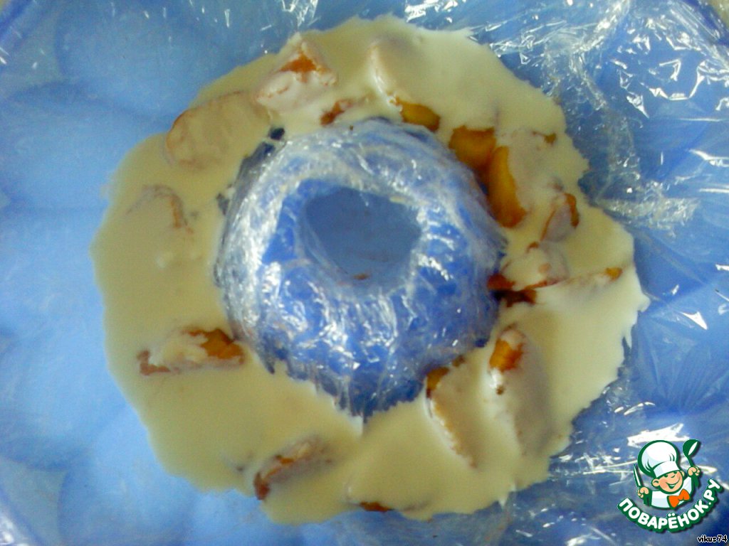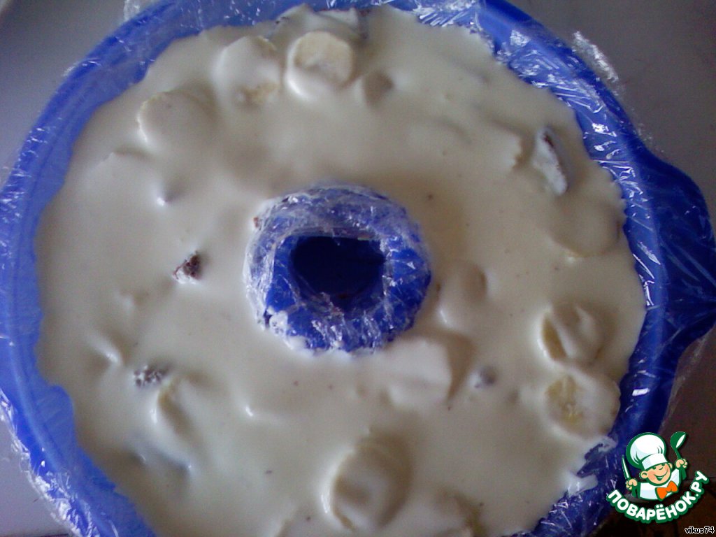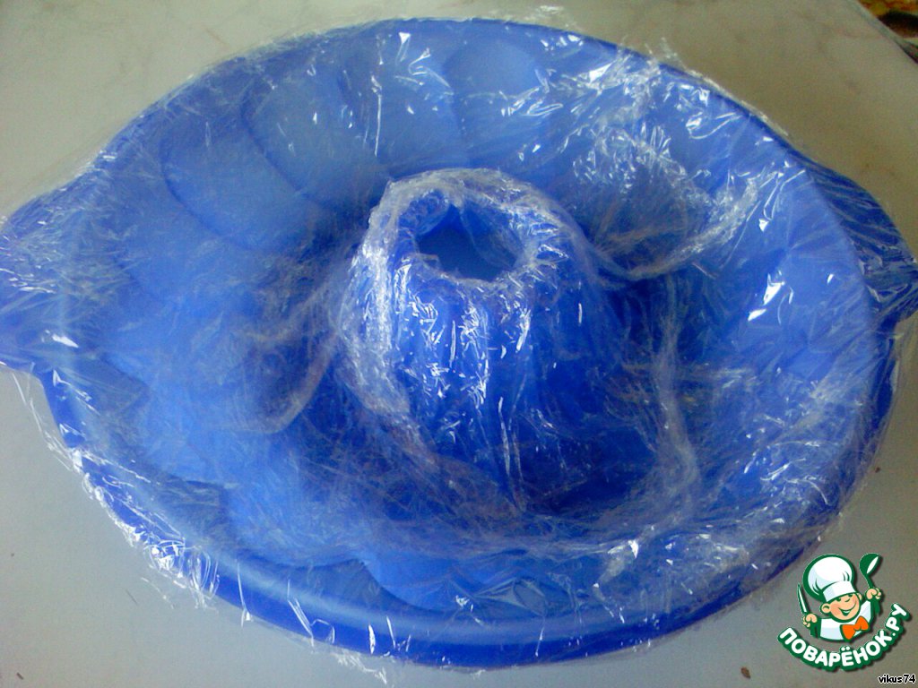 Выстелите форму для кекса или калача пищевой пленкой.