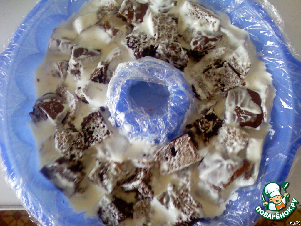 Заполните кусочками коржа форму, щедро поливая кремом и прижимая ложкой, чтобы они пропитывались.