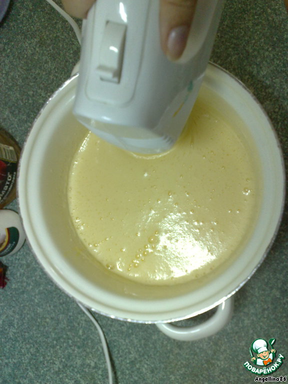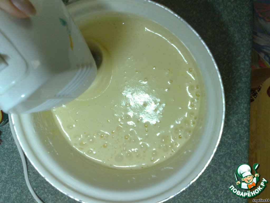 Понемногу добавлять муку, смешанную с разрыхлителем, продолжая взбивать. Тесто должно быть не слишком густым.