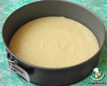 В форму, смазанную маслом (у меня 28 см диаметр), влить немного теста на один корж (из всего теста нужно выпечь 3-4 коржа)