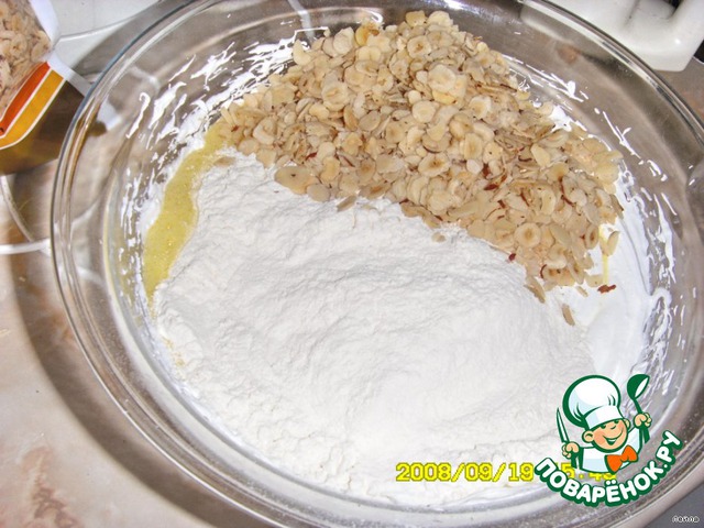 Затем муку, рубленые орехи и перемешать аккуратно лопаткой сверху вниз.