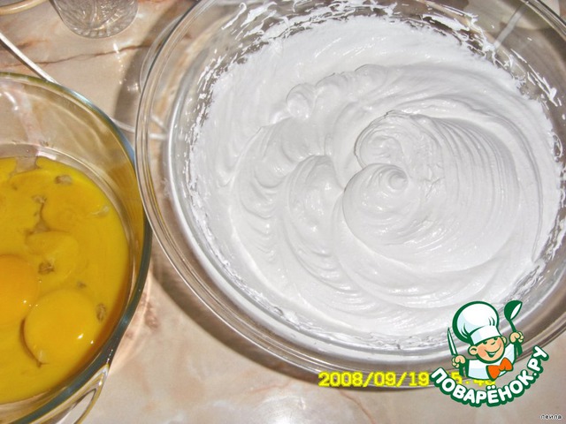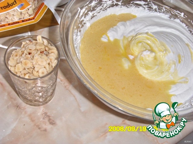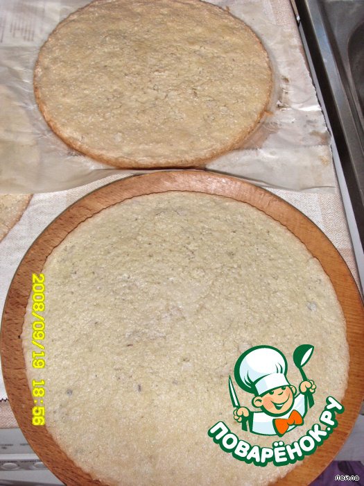 Выпечь 3 коржа при t 190 С по 7-10 минут.