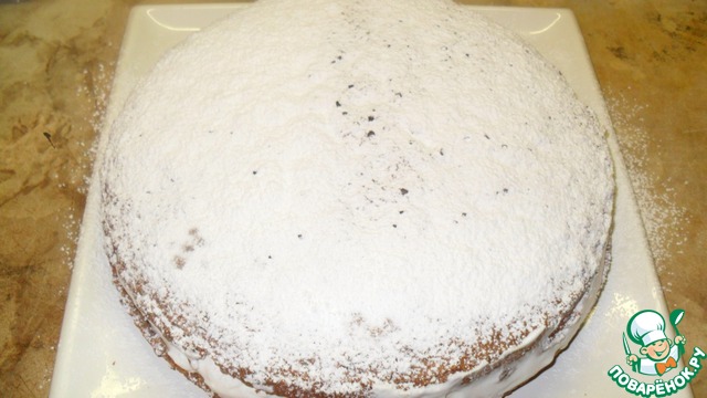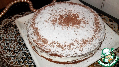 Накрываем вторым коржом. Сверху украшаем торт сахарной пудрой и тёртым шоколадом.