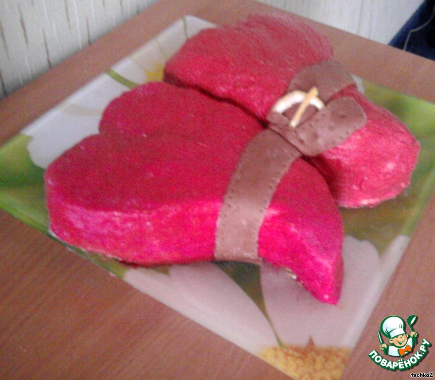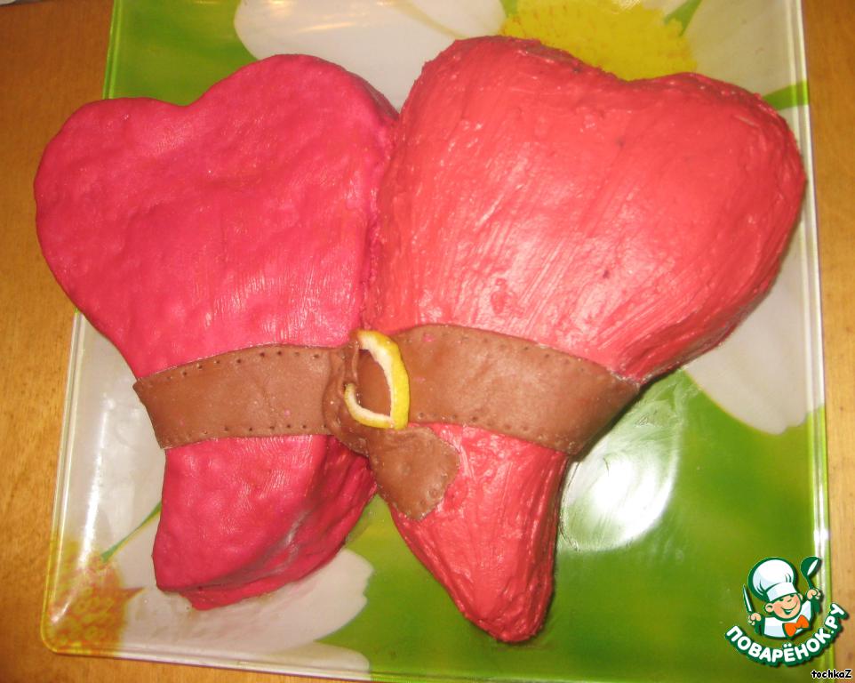 | Этот торт мы с сестрой приготовили родителям на тридцатую годовщину свадьбы! Два сердца - это два отдельных тортика, соединенные между собой навеки ремнем из мастики. |
