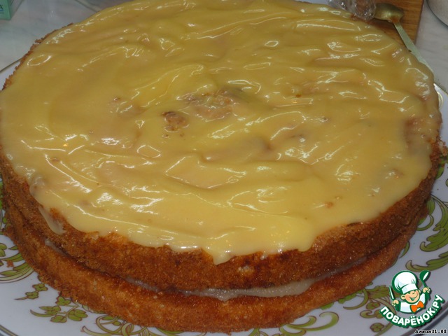 Второй корж промазать лимонным кремом и сверху положить третий корж - кольцо.