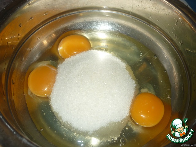 Делаем 1-ый корж - 3 яйца, 0.5 стак. сахара взбиваем в крепкую пену, просеиваем 100 гр. муки (2/3 стак.) с 0.5 ч.л. разрыхлителя и аккуратно вмешиваем в пену. Выливаем в форму, в центре делаем ямку, чтобы тесто горбом не поднималось.При желании выкладываем сверху клубнички.