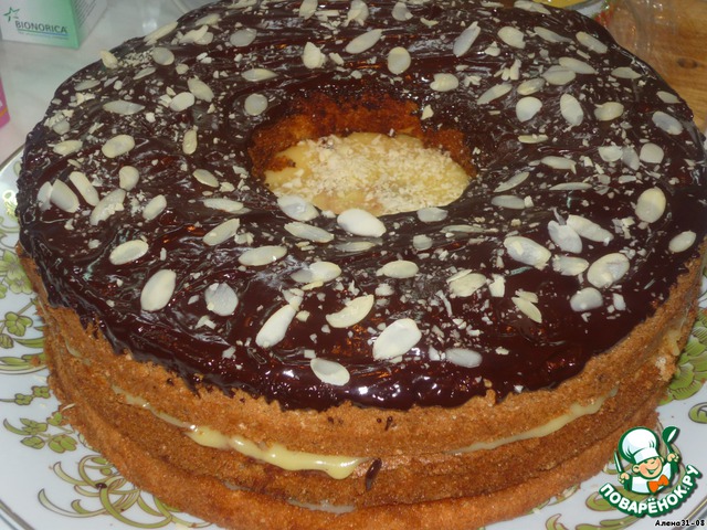 Третий корж облить растопленным шоколадом и обсыпать миндалем.