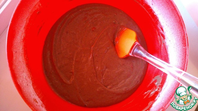 По очереди, взбивая после каждого ингредиента добавляем цедру, сметану, соду гашеную уксусом, бруснику, растопленный шоколад, постепенно муку.